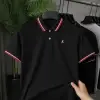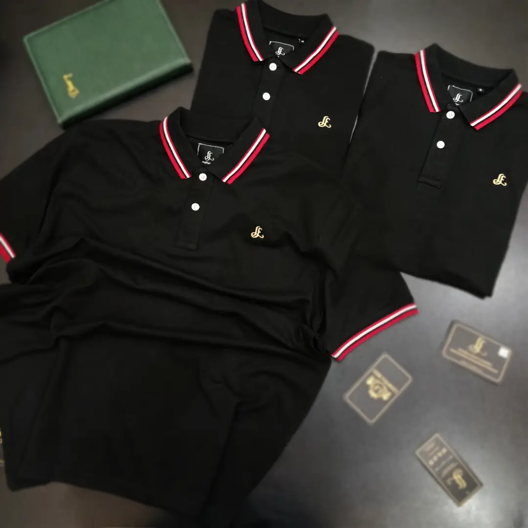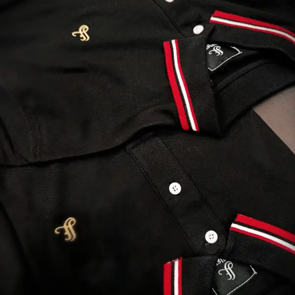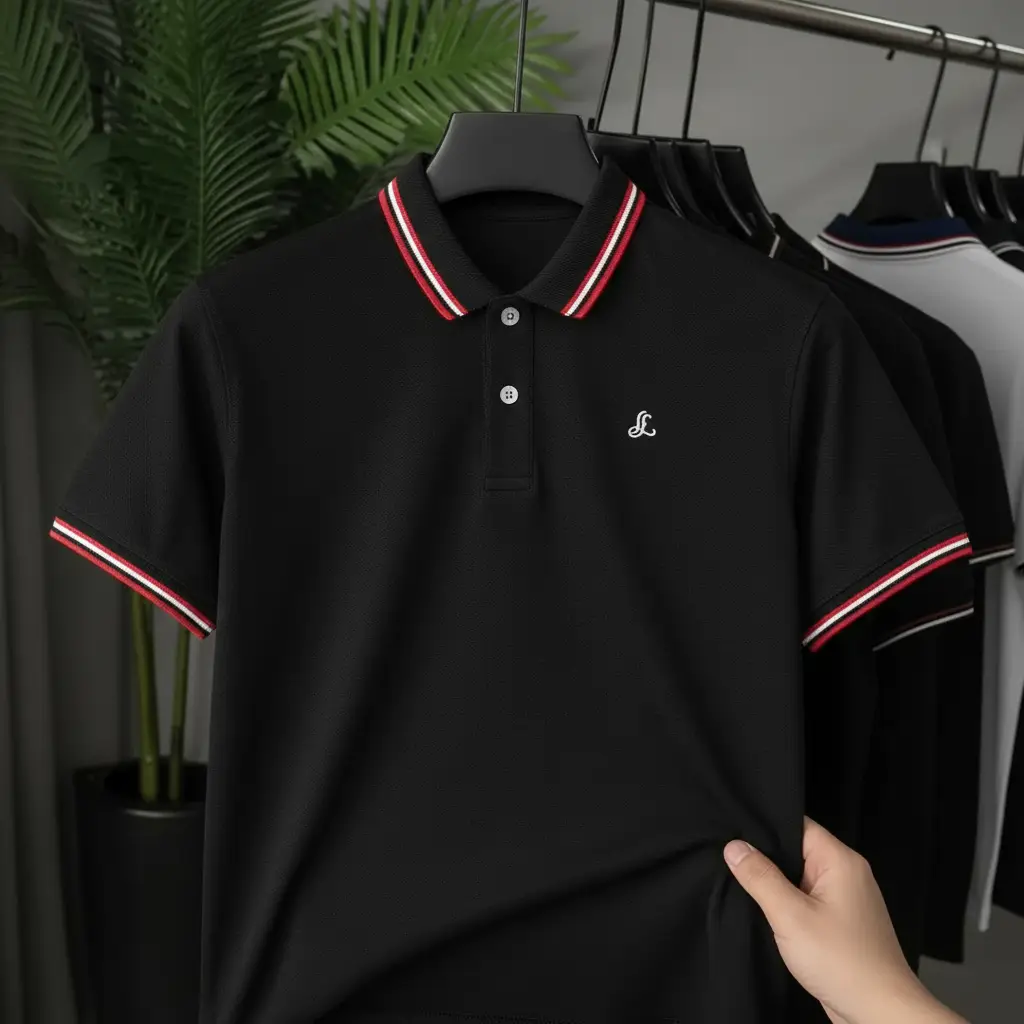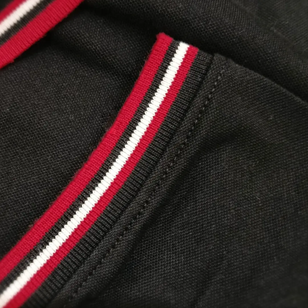Collar Style: Ribbed Polo Collar with Contrast Stripes