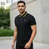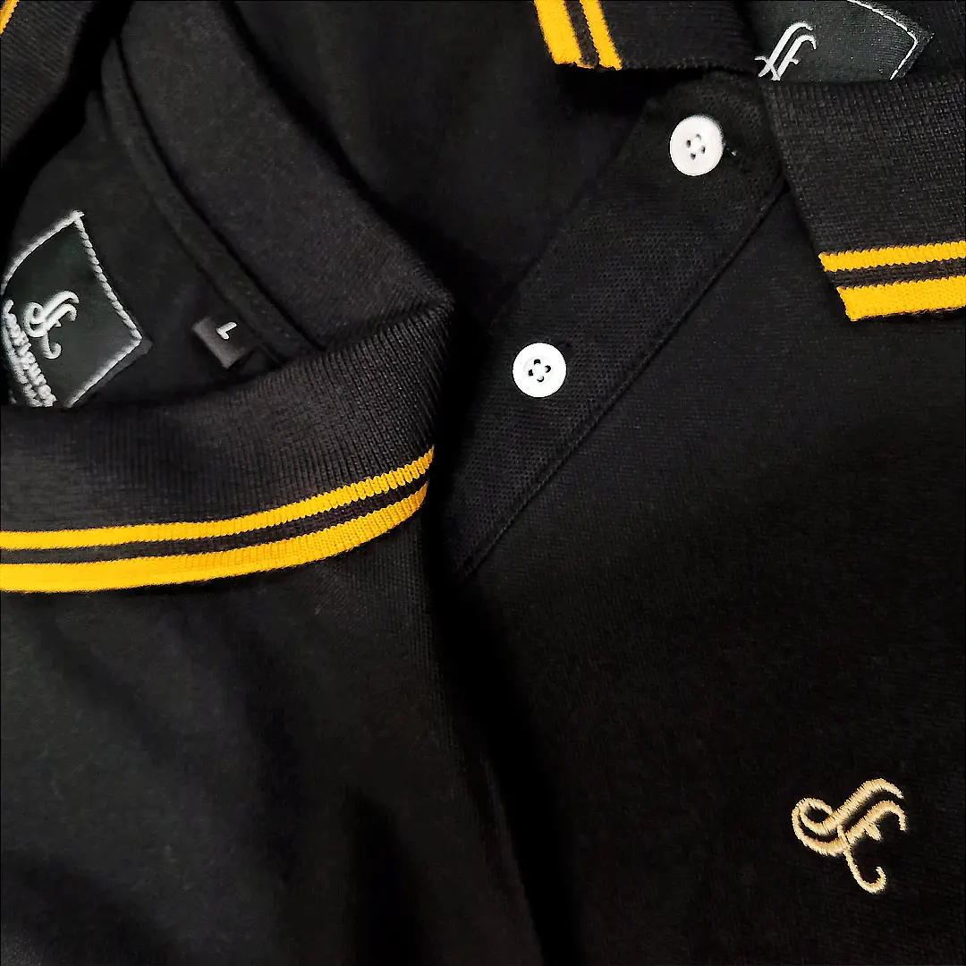 Leofigures pesh karta hai apna signature article jo aapke casual aur semi-formal look ko elevate karne ke liye design kiya gaya hai. Deep black fabric aur vibrant yellow accents ka combination isay baki polo shirts se alag banata hai.