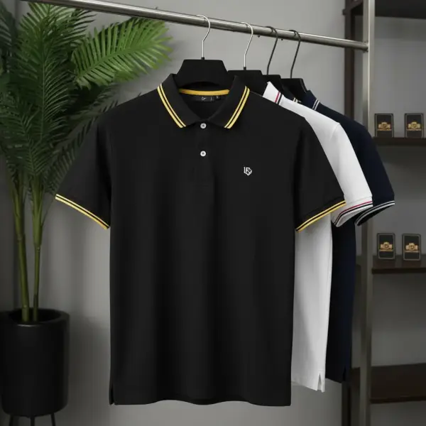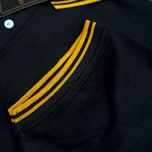 Collar Style: Ribbed Polo Collar with Contrast Stripes