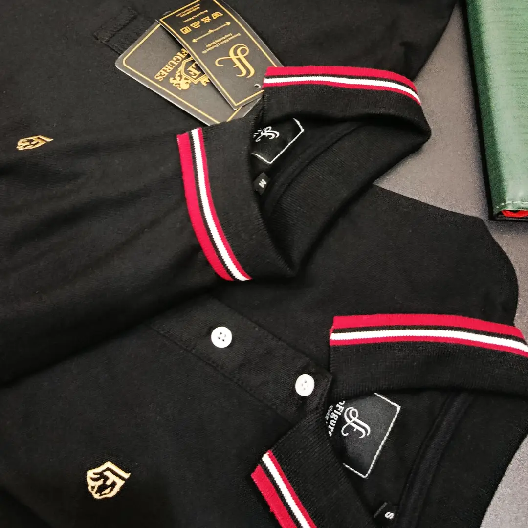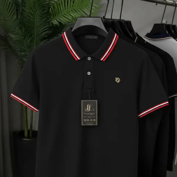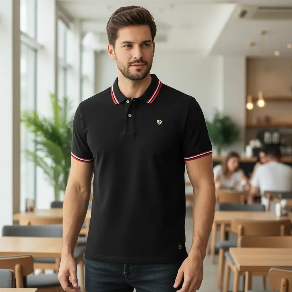 Collar Style: Ribbed Polo Collar with Contrast Stripes