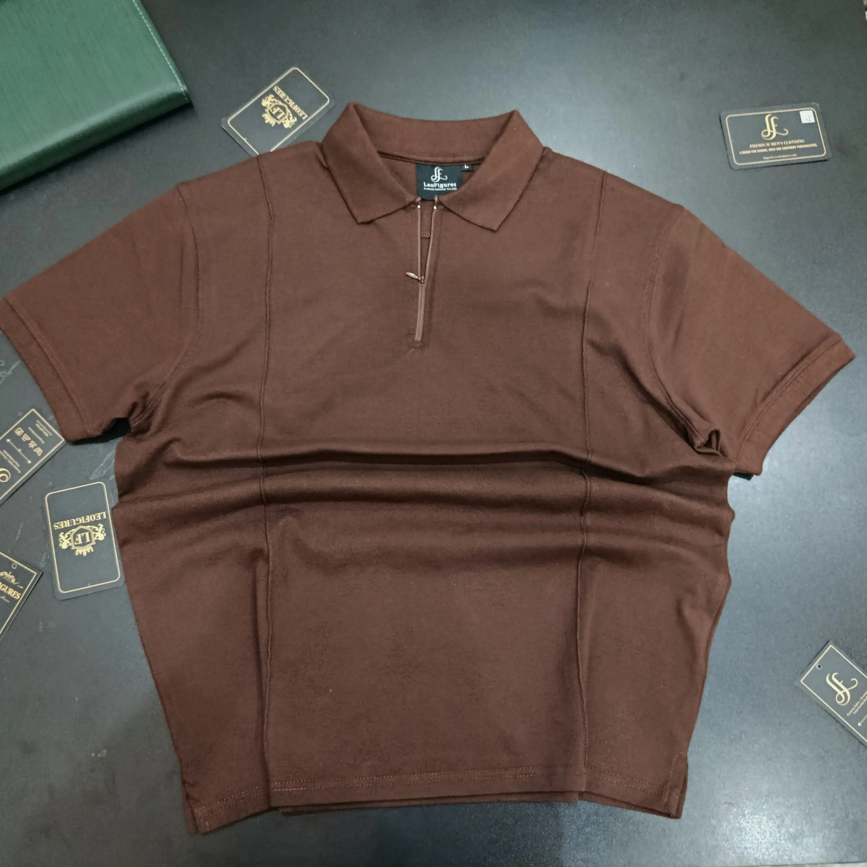 Elevate your smart-casual look with the Leofigures Front-Seam Brown Polo. This article is the definition of understated luxury. Crafted with a premium fabric that has a refined, slightly suede-like touch, this polo is a modern upgrade from the classic button-down. Its key feature is a distinct central front seam, which adds a sophisticated structural element, perfectly balanced by a high-quality metal quarter-zip closure.