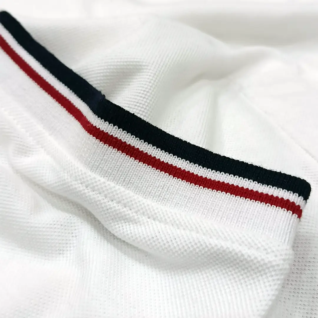 Collar Style: Ribbed Polo Collar with Contrast Stripes